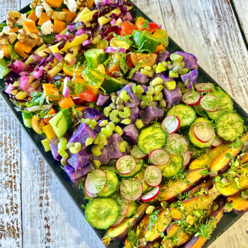 PUMPKIN, SPINACH, WALNUT AND FETA SALADMake this salad in any quantity, adjusting the ingredients to suit the number of people you’re serving.Choose a pumpkin variety suitable for roasting. Cut into bite-sized pieces (skin on or off), drizzle with a little oil, sprinkle with salt, and toss to coat. Roast in a preheated oven at 220 °C for about 15 minutes, or until fork-tender.While the pumpkin cooks, add the walnuts to the tray and roast briefly, keeping a close eye on them as they toast quickly.Once the pumpkin has cooled slightly, place it in a mixing bowl with fresh baby spinach leaves. Toss gently with a light dressing of lemon juice, olive oil, and a pinch of salt. Add cubed plant-based feta and the roasted walnuts, toss again to combine, and serve immediately. BUTTER BEANS, SHREDDED BEET LEAVES AND PICKLED ONIONTop and tail the butter beans (adjust the quantity to suit the number of people you’re serving), then cut into uniform lengths. Add to a pot of boiling salted water and cook for about 3 minutes, just until tender-crisp. Drain and cool.In a mixing bowl, combine the beans with shredded beet leaves, finely diced beet stems and pickled onion. Prepare a light dressing, drizzle over the salad, and toss gently to coat before serving. LEBANESE GARDEN SALADThis colourful salad is full of freshness and flavour. Use a mix of small tomatoes (different colours look especially nice), chop cucumber into bite-sized chunks and dice capsicum in the colour of your choice. Add finely chopped purple onion, fresh mint, and flat-leaf parsley.For the dressing, whisk together lemon juice, olive oil, salt, and a sprinkle of sumac or za’atar. Drizzle over the salad just before serving and toss gently to combine. PURPLE BLISS POTATO SALADThis salad combines the earthy sweetness of purple potatoes with the crisp bite of celery and the briny tang of capers. Light, fresh, and colourful.Dice purple potatoes and cook in lightly salted water until fork tender. Drain and allow to cool.Add finely diced celery and a spoonful of capers.Make a simple dressing with olive oil, lemon juice, and a pinch of salt.Toss potatoes with the dressing until well coated.Cover and refrigerate for at least 30 minutes before serving to allow the flavours to meld. CUCUMBER, RADISH & DILL SALADFresh and colourful, this salad brings together the cool crunch of cucumber with the peppery bite of radish. Fragrant dill adds a burst of freshness, while a light dressing ties it all together.Slice cucumber and radish into thin rounds.Add plenty of fresh dill.Make a light dressing with lemon juice, olive oil, apple cider vinegar, and a pinch of salt.Toss everything together until well coated.Chill briefly before serving for best flavour. GLAZED BABY CARROTS WITH PISTACHIOSSweet, buttery, and slightly nutty, this colourful salad makes a perfect side dish for any meal. The glaze brings out the natural sweetness of the carrots, while pistachios add crunch and parsley a touch of freshness.Ingredients500 g baby carrots (I used heirloom variety purple dragon)2 tbsp plant butter1 tbsp maple syrup½ tsp mustard powder (optional)Pinch of salt2 tbsp chopped pistachios1 tbsp finely chopped parsleyMethodPreheat oven to 200°C.In a small saucepan, melt butter and stir in maple syrup, salt, and mustard powder if using.Place baby carrots in a baking dish and pour the glaze over them, tossing to coat.Roast for 15–20 minutes, or until fork tender.Allow to cool slightly, then sprinkle with chopped pistachios and parsley before serving.