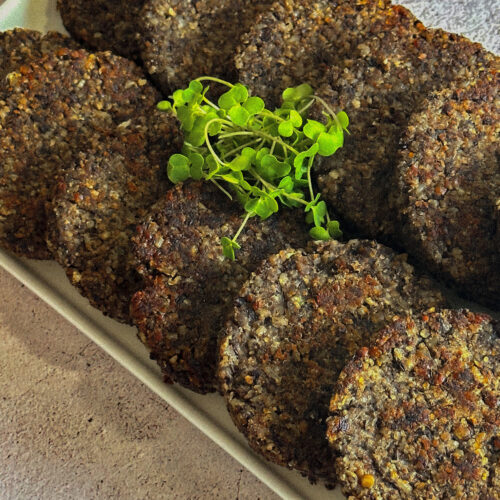*Add the flax-meal and psyllium husk, then pulse a few times to mix evenly. Shape the mixture into patties using ring moulds or your hands.