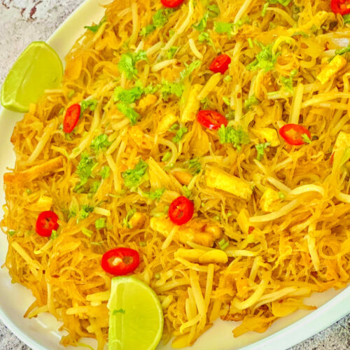 *Spoon noodle stir fry on to a serving platter.*Garnish with thin sliced chilli and finely chopped coriander or spring onion, for colour .*Serve with freshly cut wedges of lime.