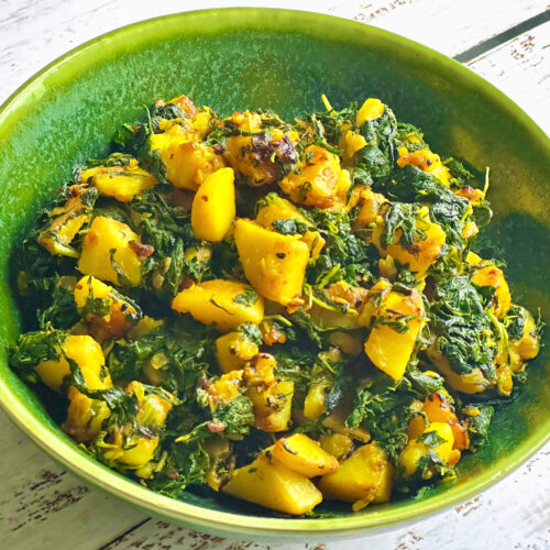 Perfect for a comforting plant-based meal, this green leaf and potato dish is made with simple, everyday ingredients. Serve it with steamed rice or warm flatbreads such as roti or naan, and enjoy.