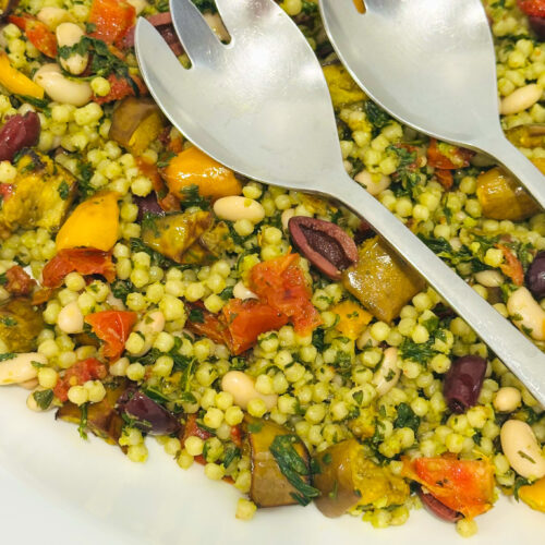 - 105 g or ¾ cup uncooked large pearl or Israeli couscous